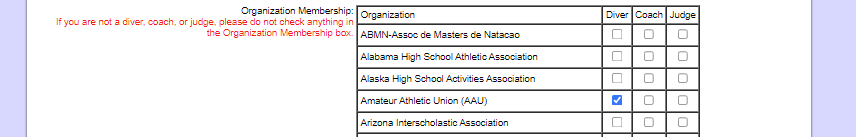 - Scroll down past the information you filled out and under "Organization Membership", click the first box for "Amateur Athletic Union (AAU)" (this is one of the first ones listed) and "USA Diving" (this is one of the last ones listed).