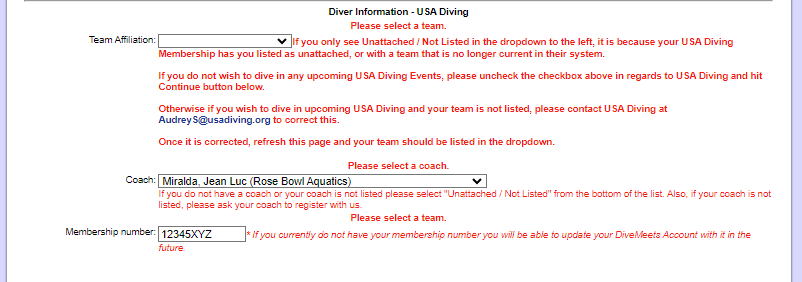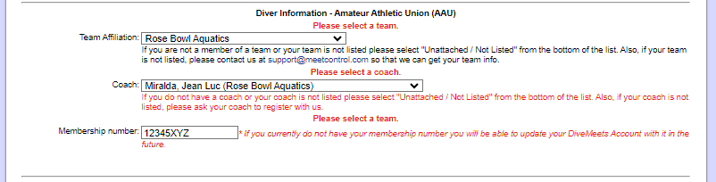 - Make sure the information is accurate - and hit update. You will notice how the page refreshes and just shows you the same page again. That is OK! Scroll down all the way and you will see a couple of drop down menu's show up. This is the part you are updating! You will add your new USA Diving and AAU Diving Membership.