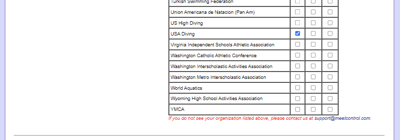 Step 3: These are the boxes you will checkmark! Make sure they are the ones for AAU and USA Diving!