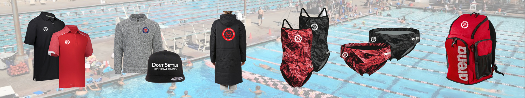 Rose Bowl Diving has partnered with The Swim Guys for our exclusive team gear. This includes competition suits, backpacks, warm-ups and more. Divers in our Blue, Red and Black teams are required to have a team suit used for all competitions.